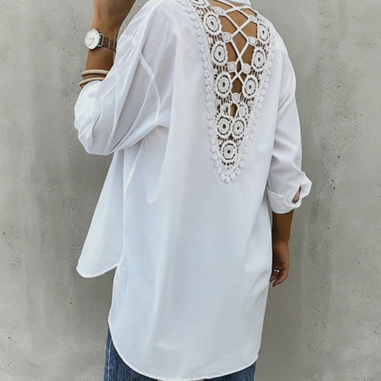 Design Details: Features a classic turn-down collar and button-front closure. The back is spliced with guipure lace and sheer mesh panels, adding subtle transparency and texture while keeping the front clean and suitable for everyday wear.