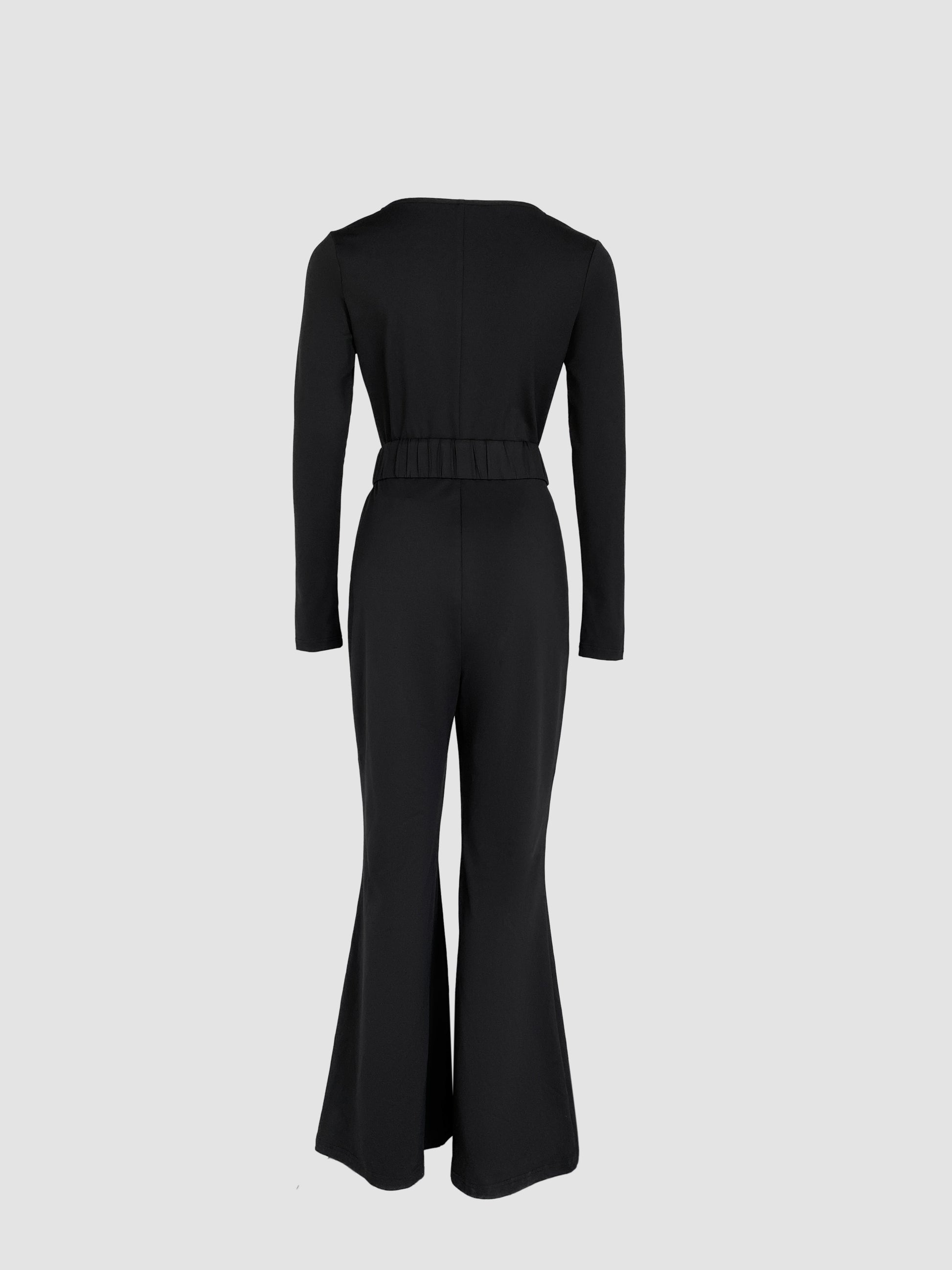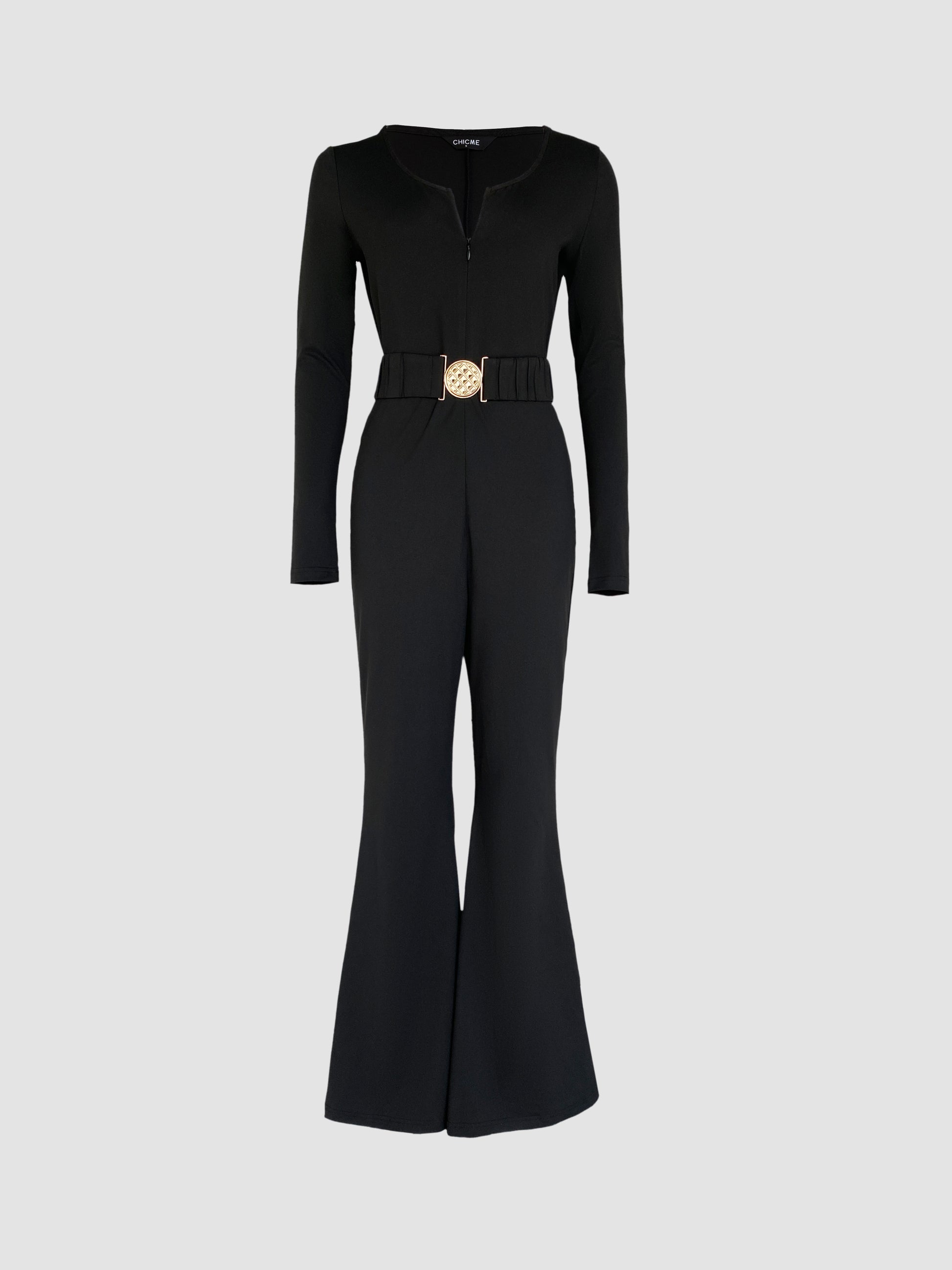 U-Neck Zipper Front Long Sleeve Slim Fit Flared Jumpsuit with Belt