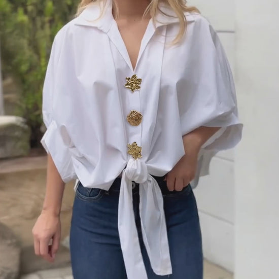 Design Details: Golden floral buttons add a vintage palace-inspired touch, becoming a striking focal point along the placket. The turn-down collar and three-quarter batwing sleeves blend shirt polish with romantic retro charm.