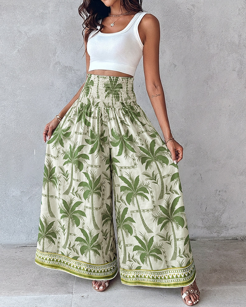 Vintage Plants Print High Waist Shirred Elastic Waist Wide Leg Pants