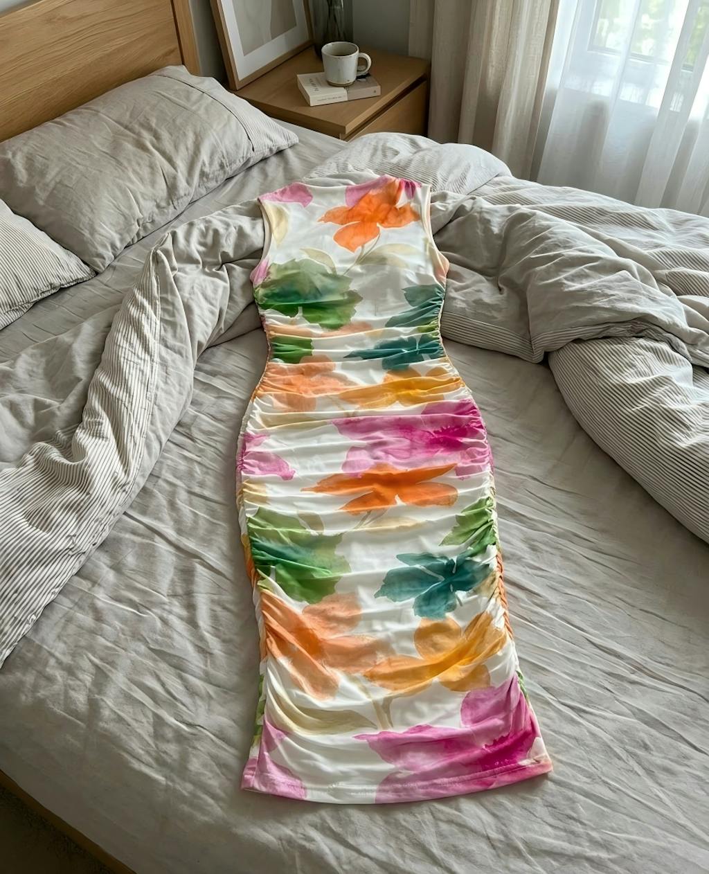 Watercolor Floral Print Mock Neck Sleeveless Ruched Mid-length Dress Slim Fit Zipper Back Party Dress