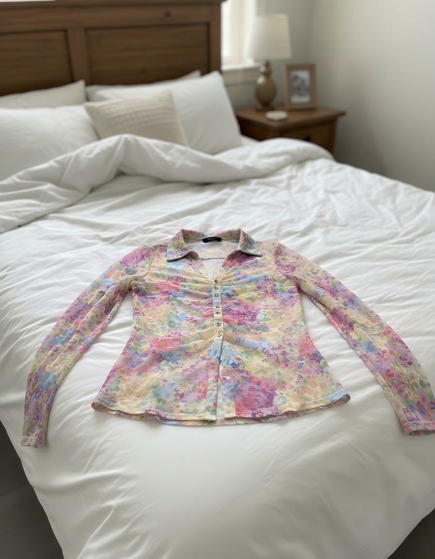 Design Details: Features a turn-down collar combined with a V-neck and button front, preserving a polished shirt look. Ruched detailing adds texture and depth, while the sheer mesh base enhances visual layering and a subtle sensual finish.