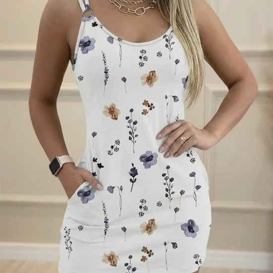 Design Details: U-neckline paired with double spaghetti straps adds layered detail at the shoulders. Backless design enhances lightness, while side pockets add practical function. Watercolor floral print brings a soft, casual visual finish.