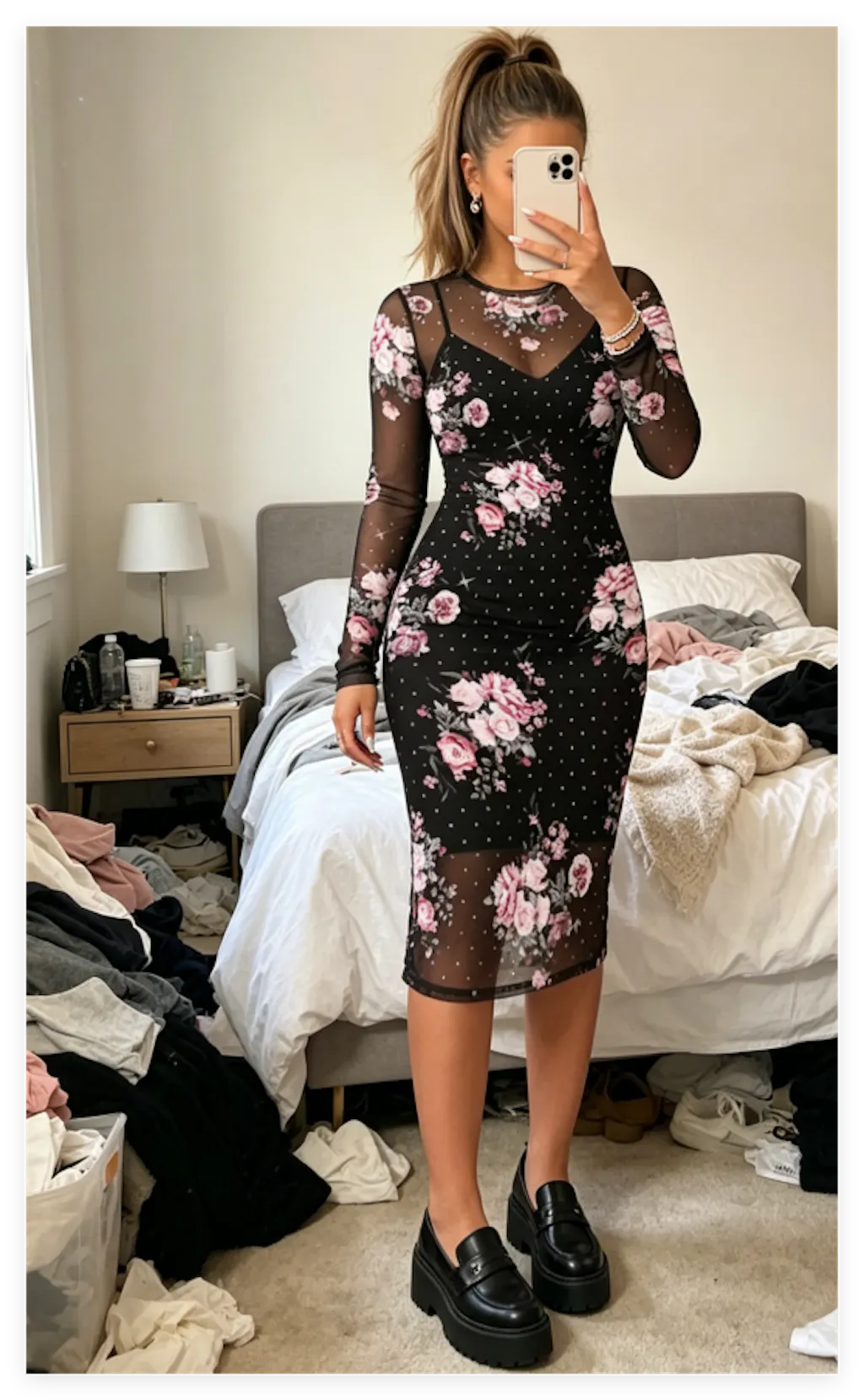 Amazing quality! Sheer mesh long sleeves with rhinestones, flattering bodycon, floral print and matching slip.