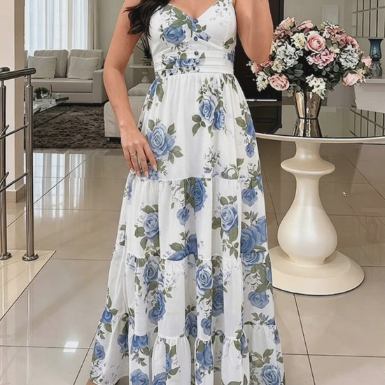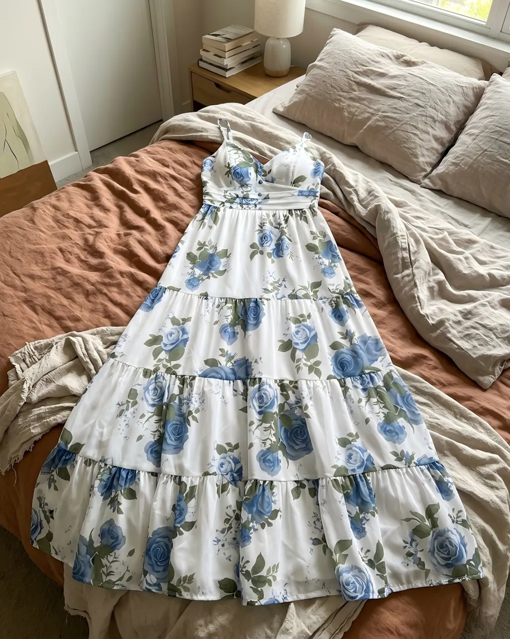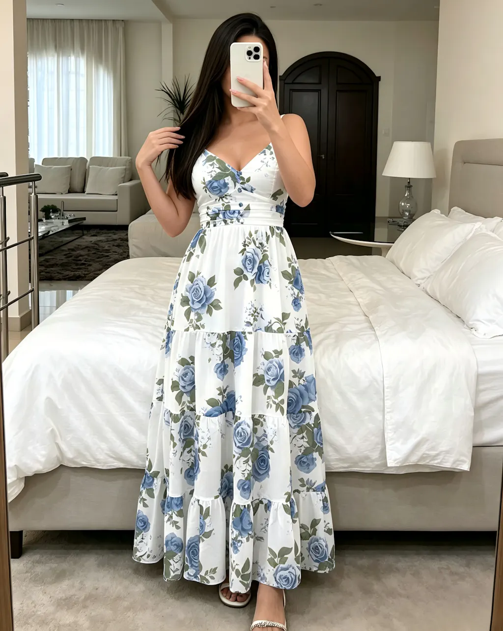 STYLING - Versatile Romantic Foundation: This refined printed chiffon maxi dress serves as a functional foundation for diverse high-style looks. Pair with strappy lace-up sandals and a straw sun hat for an "effortless-vacation" aesthetic, or style with a delicate cardigan and block heels to transition into a sophisticated, casual-cool ensemble for garden weddings, weekend brunches, or romantic sunset dinner dates.