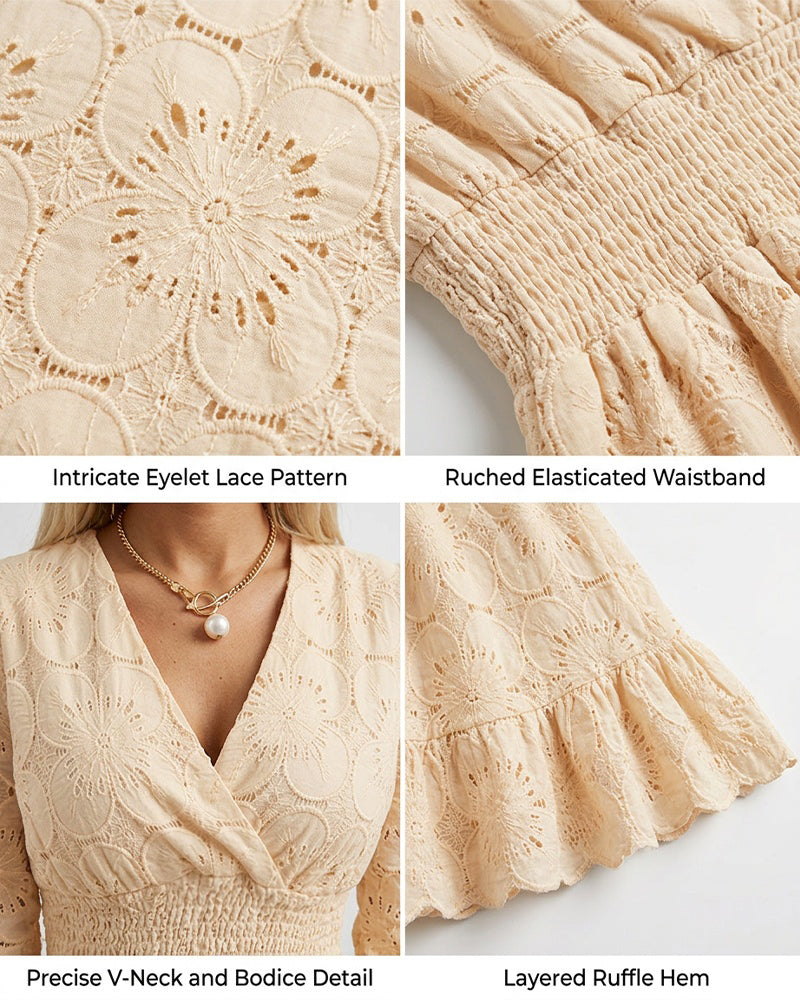 DESIGN - Shirred Waist & Ruffles: Elevated by a flexible shirred waistband for maximum comfort and delicate ruffle details at the cuffs and hem. The sheer 3/4 lace sleeves and intricate floral patterns add a modern, architectural edge.