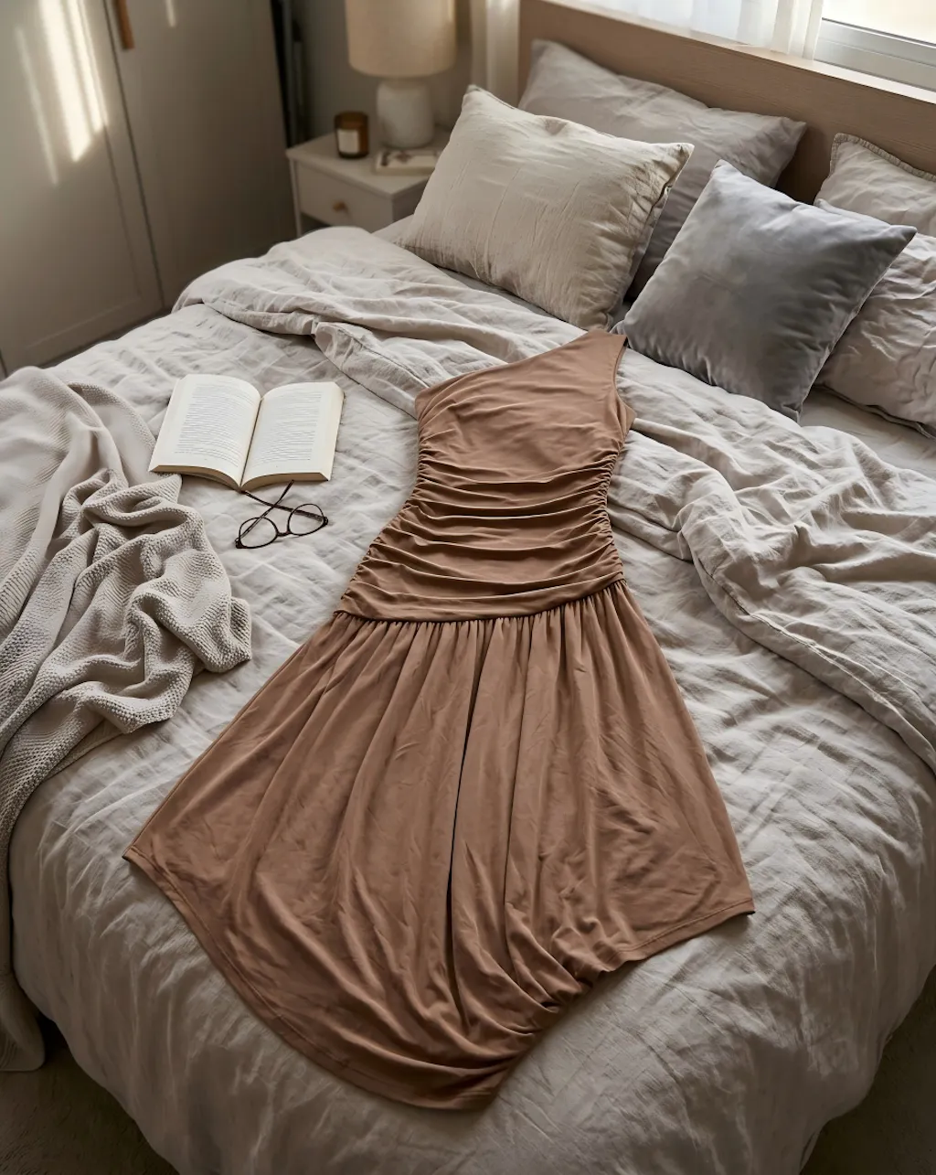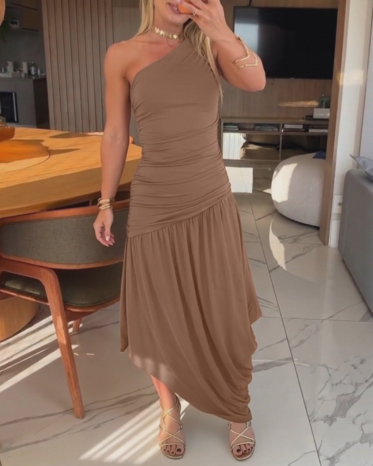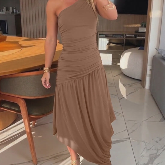SILHOUETTE - Refined Contouring Frame: Features a dramatic one-shoulder neckline and a precision-contoured bodycon profile that transitions into an airy, asymmetrical hem. This frame is engineered to follow the body's natural lines, utilizing the diagonal cut of the neckline to visually elongate the neck and torso while the irregular skirt length creates a streamlined, statuesque profile.