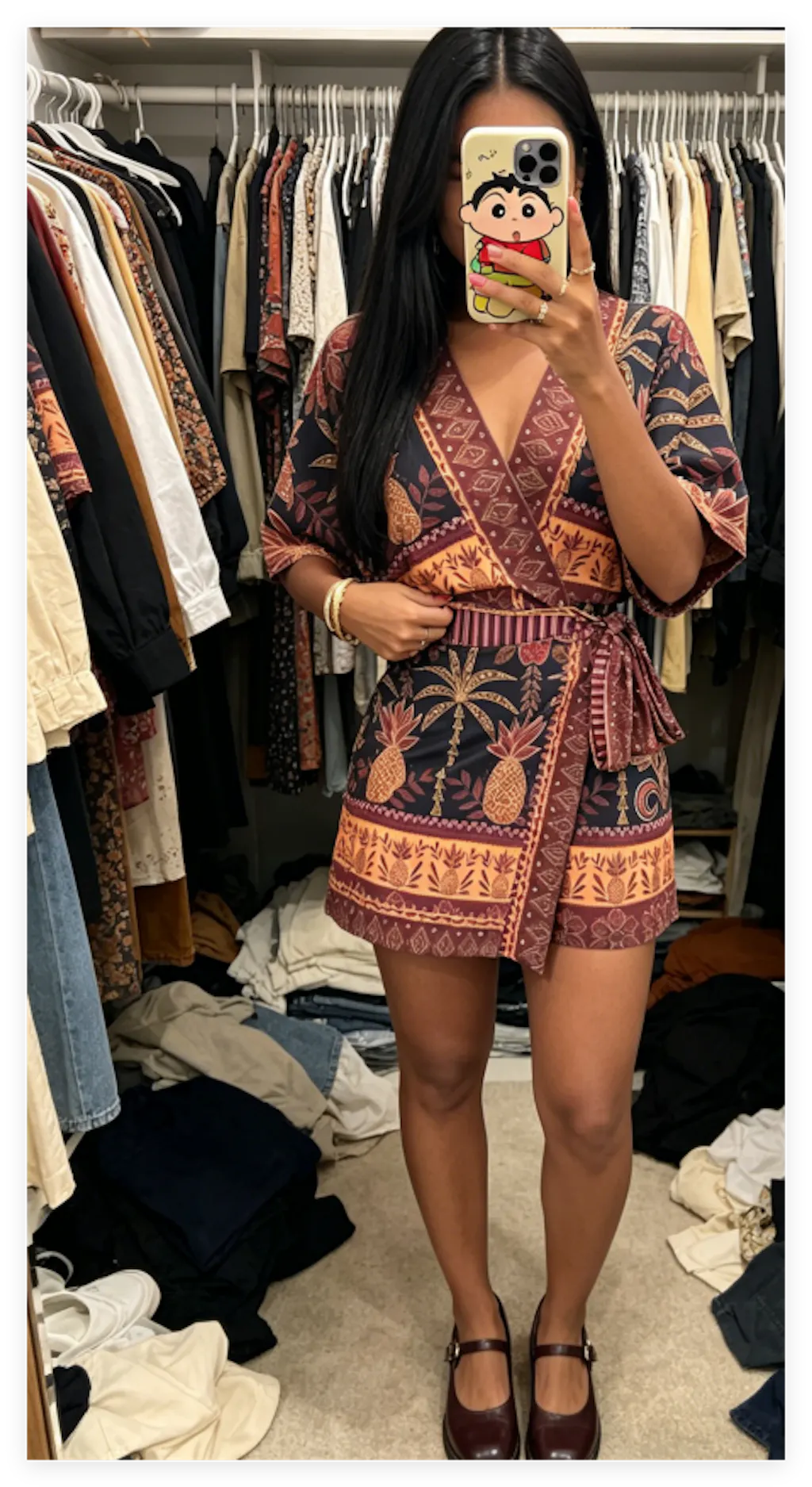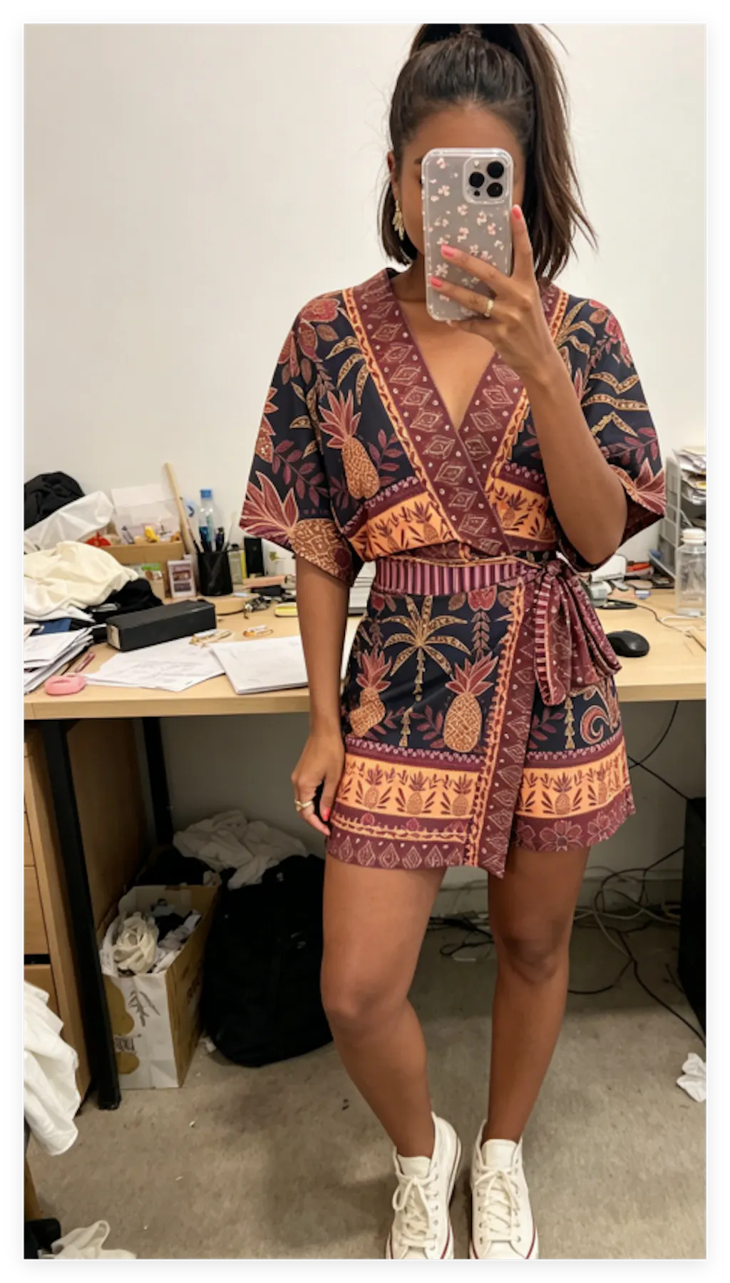 DESIGN - Botanical Artistry & Tied Details: Elevated by a high-impact narrative of vintage pineapple motifs and a strategic fake two-piece skirt-overlay. Meticulously engineered with an adjustable side-tie waist to allow for a personalized fit. This design balances modern "Resort-glam" aesthetics with intentional structural details for a secure, breezy, and photogenic profile.
